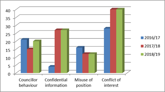 Complaints data gained over almost three entire council terms has provided some interesting insights into the conduct of elected councillors. The above graph depicts data over the past three years but compared to the three council terms, it is consistent across those terms.